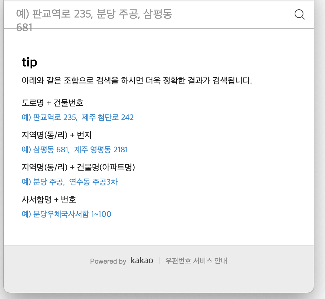 카카오 도로명 주소 api는 직접 서버에 올리고 웹뷰로 받아와야 됩니다.