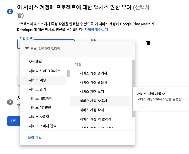 완료를 누르면 서비스 계정이 생성되는 것을 확인할 수 있습니다.