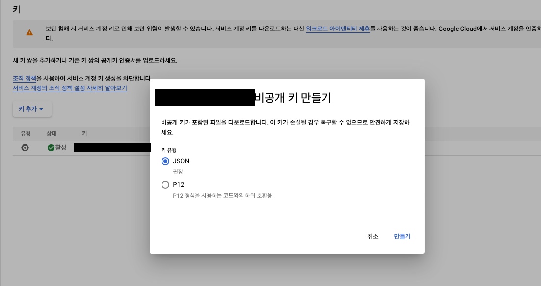 생성된 서비스 클릭 > 키 탭 클릭 > 키 추가 > 새 키 만들기 > JSON로 생성 해줍니다.
