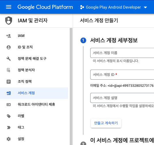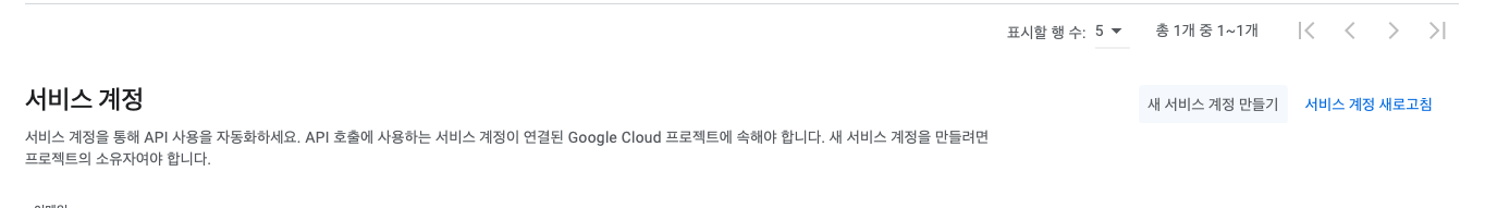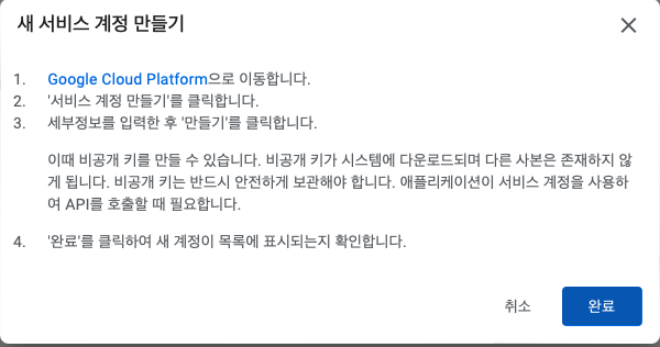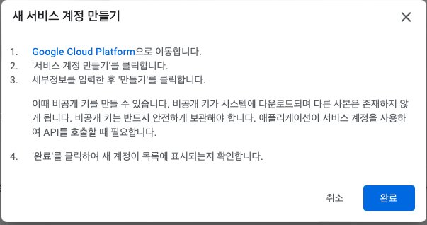 그리고 새 서비스 계정 만들기를 눌러 Google Cloud Platform으로 이동합니다.