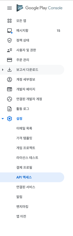 먼저 구글 플레이스토어에 올리기 위해서 구글 플레이 콘솔에 로그인 후, 오른쪽 목록에 있는 API 액세스에 들어옵니다.