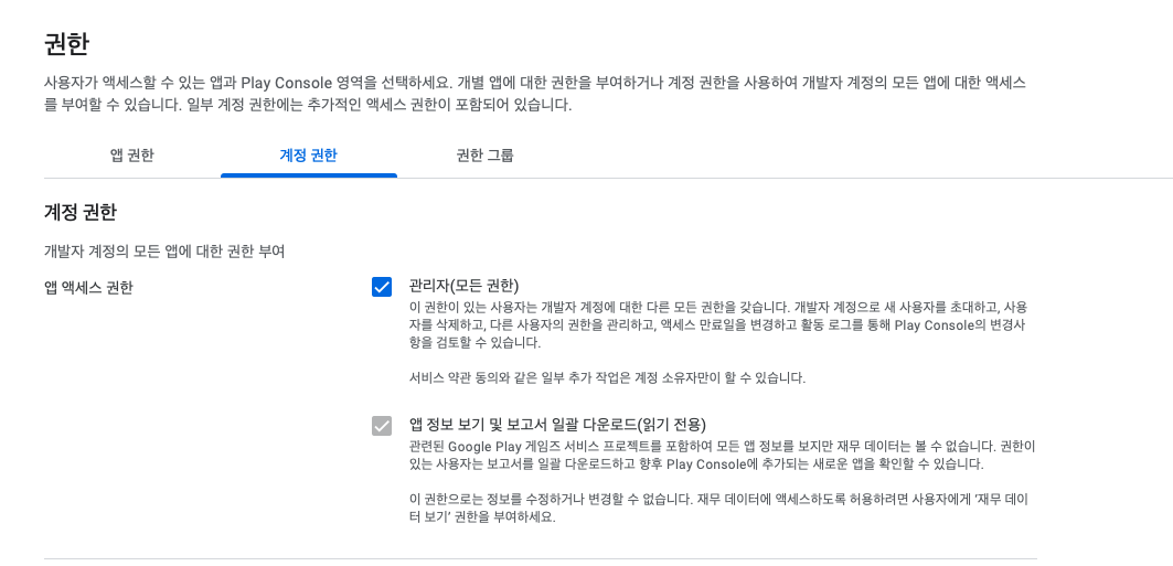 마지막으로 계정 권한에서 관리자 권한을 주고, 앱 권한 부분에는 원하는 애플리케이션을 설정해주면 됩니다.