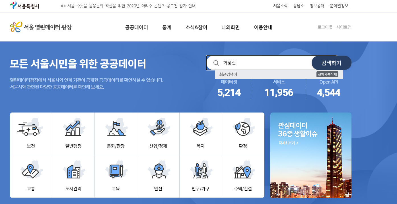 서울시 공중화장실 위치정보를 선택 후에