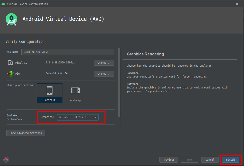 Graphics를 Hardware - GLES 2.0으로 설정하고 생성을 합니다.
