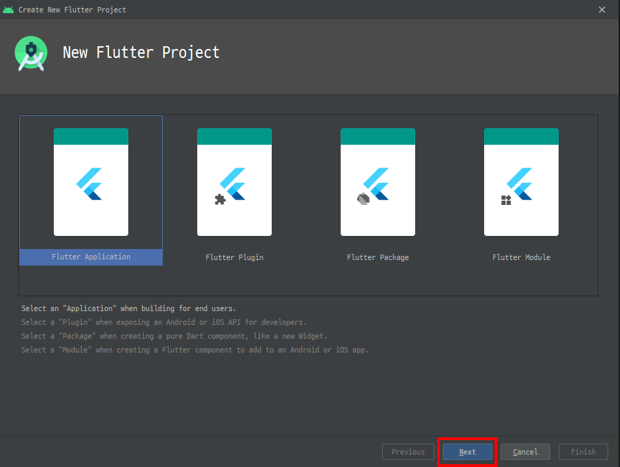 프로젝트 이름은 기본으로 하고 SDK는 압축을 푼 플러터 폴더로 지정합니다.