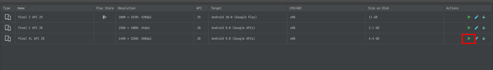 안드로이드 스튜디오 상단에 있는 에뮬레이터 버튼을 누릅니다.