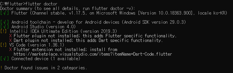 라고 커맨드에 입력을 하면 플러터의 검사를 시작합니다.