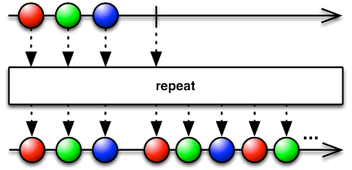 Observable에서 발행한 빨간색, 초록색, 파란색 원을 무한히 반복해서 발행합니다.