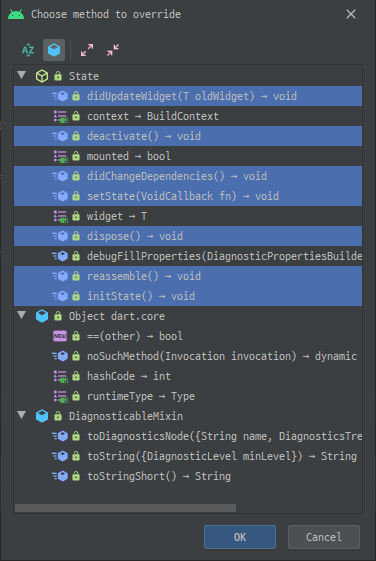 먼저 _MyStatefulWidgetState 안에서 ctrl + o를 눌러 override 가능한 함수들을 확인합니다.