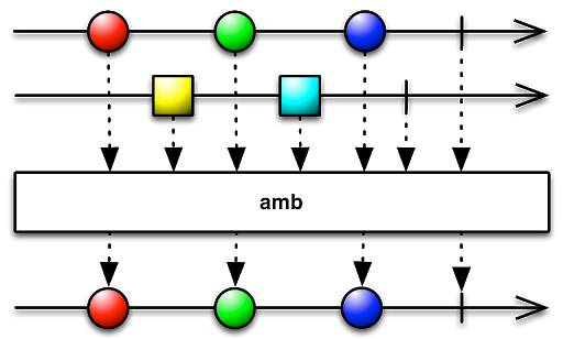 여러 개의 Observable 중에서 1 개의 Observable을 선택하는데, 선택 기준은 가장 먼저 데이터를 발행하는 Observable입니다. 나머지 Observable에서 발행하는 데이터는 모두 무시합니다.