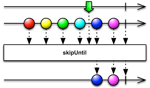 takeUntil 함수와는 다르게 다른 Observable에서 화살표가 나올 때까지는 값을 발행하지 않고 건너뛰다가 다른 Observable에서 값을 발행하는 순간부터 원래 Observable에서 값을 정상적으로 발행하기 시작합니다.