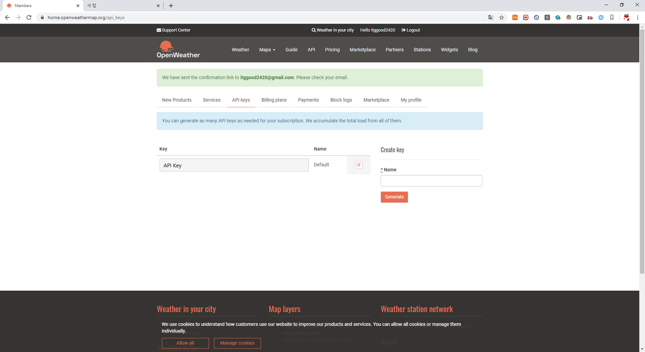 회원 가입을 완료하면 API 메뉴를 누른 후, Cueent weather data에 있는 Subscribe를 누릅니다.