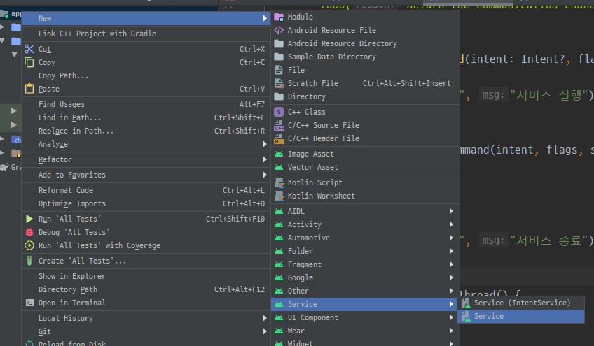 New > Service > Service (IntentService)를 눌러 생성합니다.