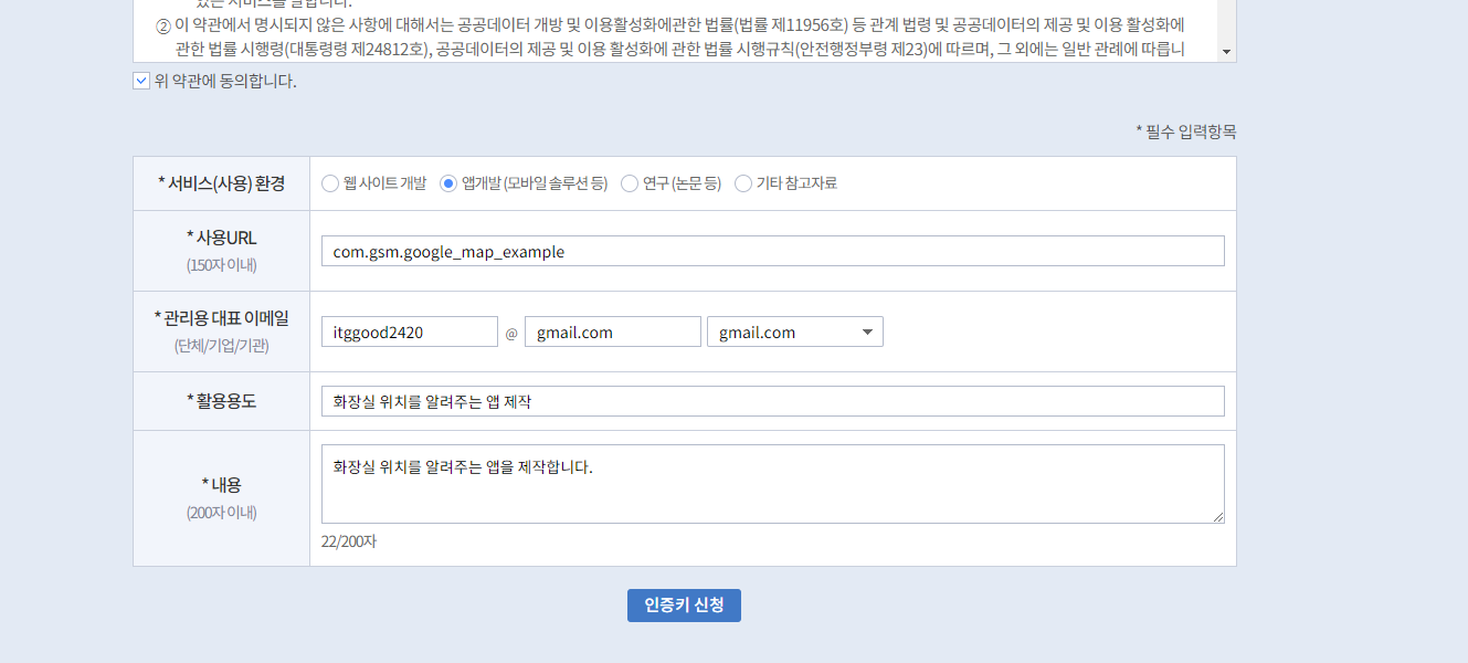 인증키 신청을 눌러주고 인증키를 신청합니다.