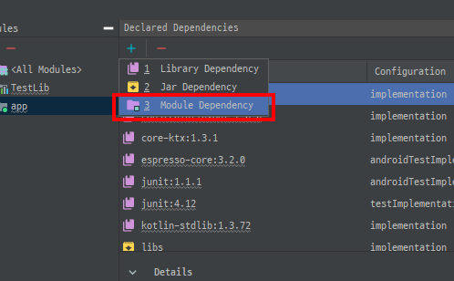 Dependencies > app > + 를 클릭합니다.